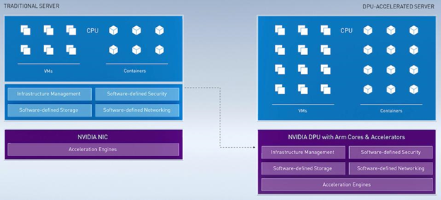 As the basic compute unit moves from chips to datacenters, a different kind of processor, sitting beside a CPU, is needed to handle the datacenter infrastructure functions that are increasingly encoded in software, which is where Data Processing Units (DPU, also called “SmartNIC”) come in. Described by Nvidia as a “programmable data center on a chip”, DPUs from Mellanox take the low-level networking, storage requests, security, anomaly detection, and data transport functions away from CPUs. 5 years from now Nvidia thinks every data center node could have a DPU, as embedding security at the node level plays to the zero trust security paradigm and offloading infrastructure processes from CPUs accelerates workloads. Something like 30% of cloud processing is hogged by networking needs. CPUs that should be running apps are instead managing the infrastructure services required to run the apps (a single BlueField 2 DPU provides the same data center services as 125 x86 cores). Just as Nvidia’s GPUs have CUDA software running on top, DPUs have complementary APIs and frameworks (DOCA SDK) for developers to program security and networking applications.