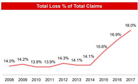 To the extent that the bull thesis rests on responsible international expansion and a favorable view on the broader trends driving accident rates, Copart and IAA seem like superior bets. About those trends. When a car gets into an accident, an insurer must determine whether or not the vehicle is worth saving. It does so by comparing the cost of repairing the car versus the amount it could recognize by deeming the vehicle a total loss and selling it at a salvage auction. So, if a car was valued at $10k before the accident and it takes $6k in repairs to restore the car to its “pre-accident value” and another $1k to supply the claimant with a rental while his car gets fixed, then the insurer will choose to send the car to salvage if it thinks it can get more than $3k for it at auction [that’s $10k less $6k less $1k], and repair the car otherwise. The proportion of cars deemed a total loss has been trending higher over the last several years, driving growth in salvage auction volumes: